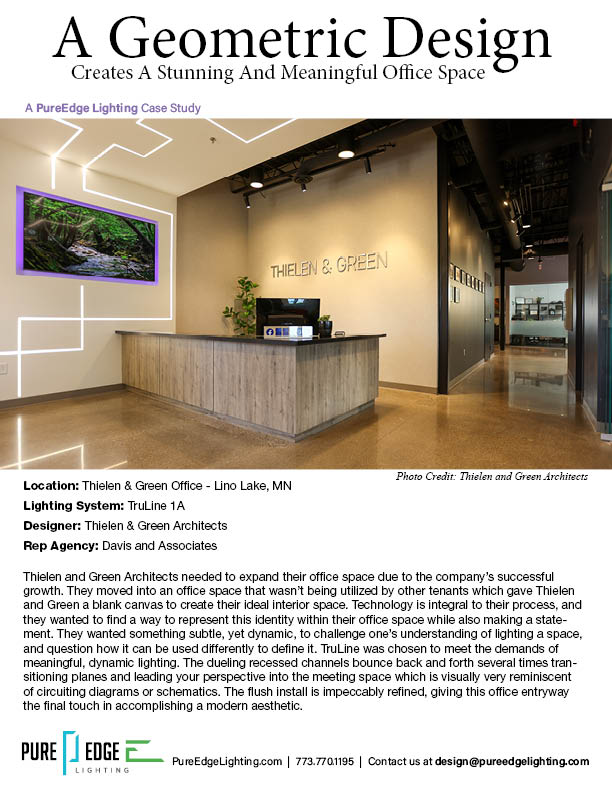 Thielen and Green Architects needed to expand their office space due to the company's successful growth. They moved into an office space that wasn't being utilized by other tenants which gave Thielen and Green a blank canvas to create their ideal interior space. Technology is integral to their process, and they wanted to find a way to represent this identity within their office space while also making a statement. They wanted something subtle, yet dynamic, to challenge one’s understanding of lighting a space, and question how it can be used differently to define it. TruLine was chosen to meet the demands of meaningful, dynamic lighting. The dueling recessed channels bounce back and forth several times transitioning planes and leading your perspective into the meeting space which is visually very reminiscent of circuiting diagrams or schematics. The flush install is impeccably refined, giving this office entryway the final touch in accomplishing a modern aesthetic.