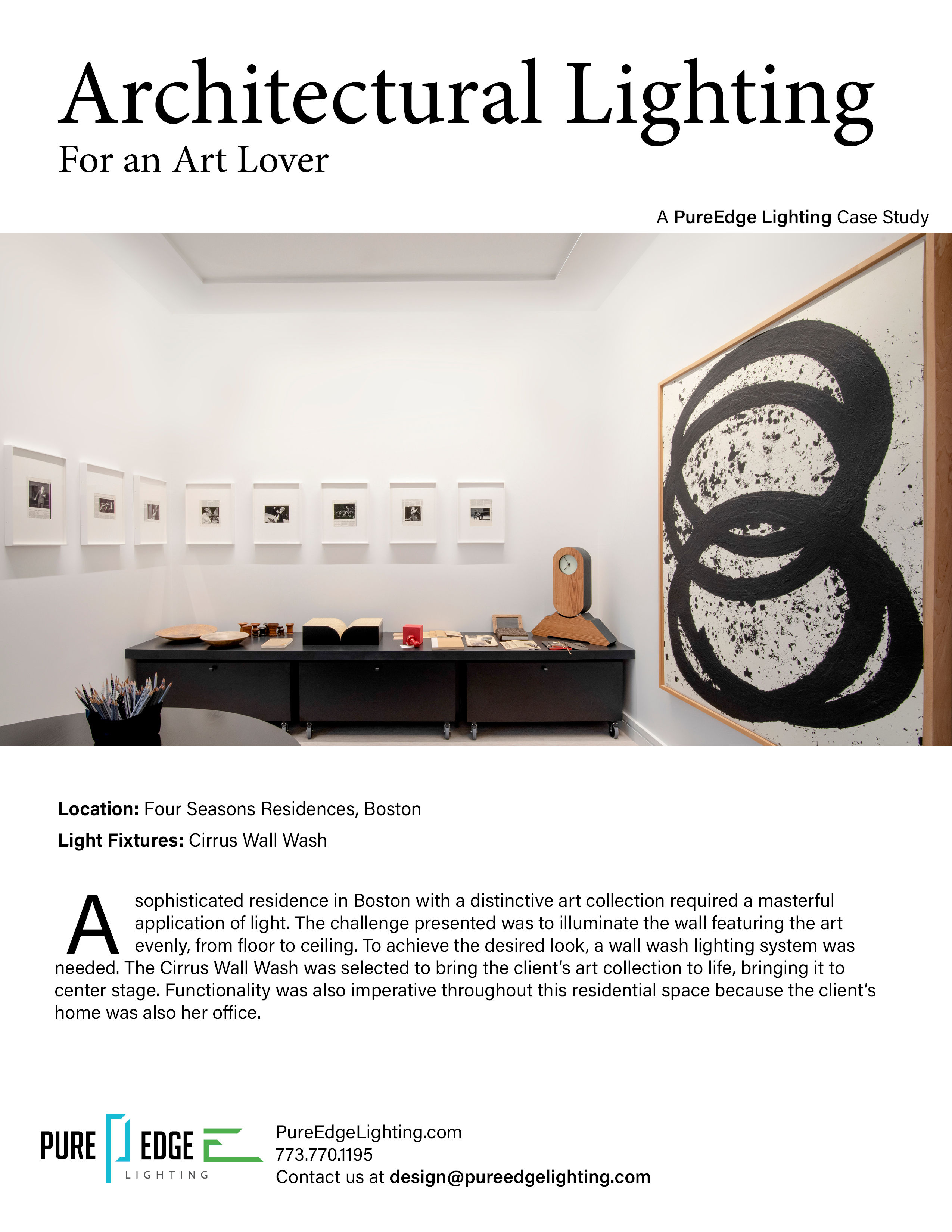 A sophisticated residence in Boston with a distinctive art collection required a masterful application of light. The challenge presented was to illuminate the wall featuring the art evenly, from floor to ceiling. To achieve the desired look, a wall wash lighting system was needed. The Cirrus Wall Wash was selected to bring the client's art collection to life, bringing it to center stage. Functionality was also imperative throughout this residential space because the client's home was also her office.