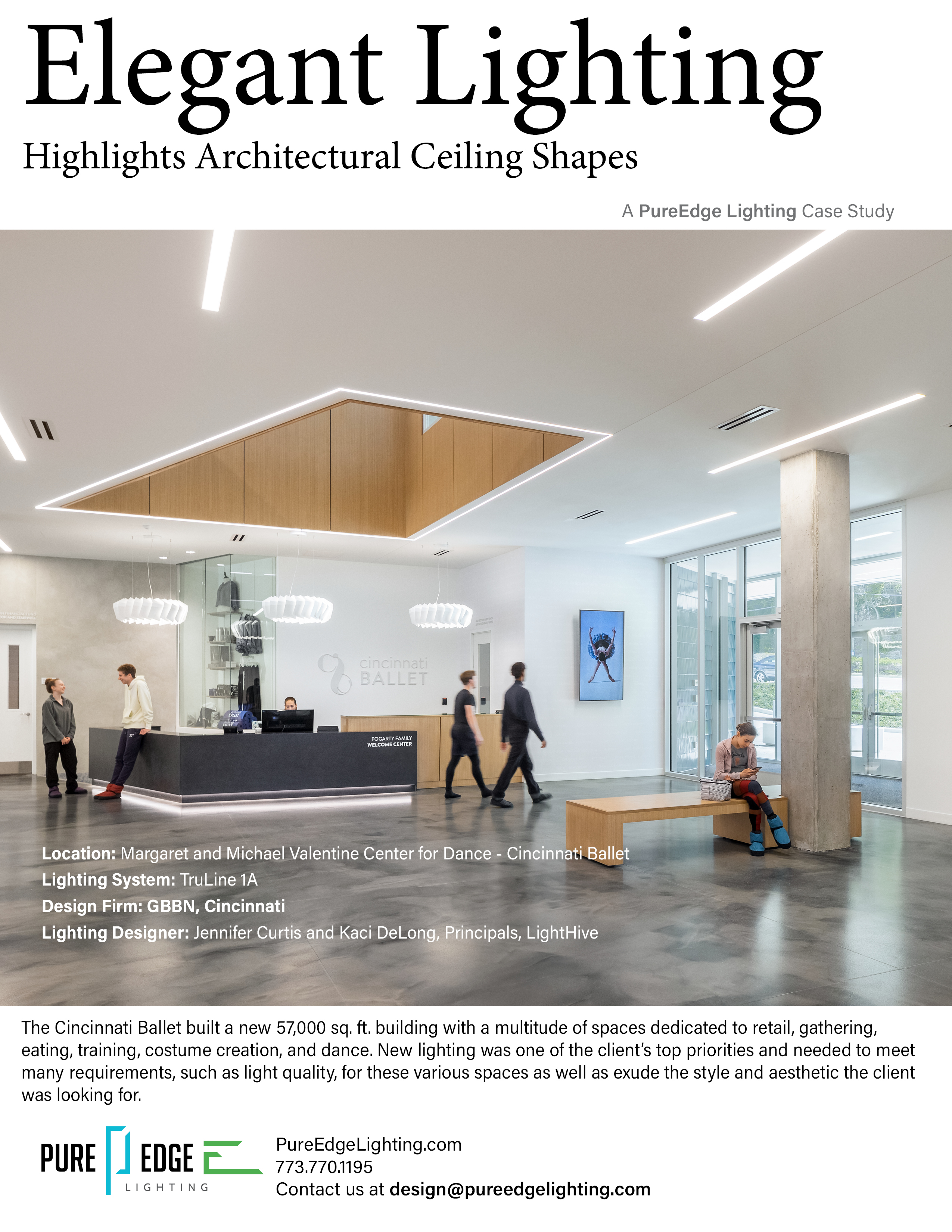 The Cincinnati Ballet built a new 57,000 sq. ft. building with a multitude of spaces dedicated to retail, gathering, eating, training, costume creation, and dance. New lighting was one of the client’s top priorities and needed to meet many requirements, such as light quality, for these various spaces as well as exude the style and aesthetic the client was looking for.