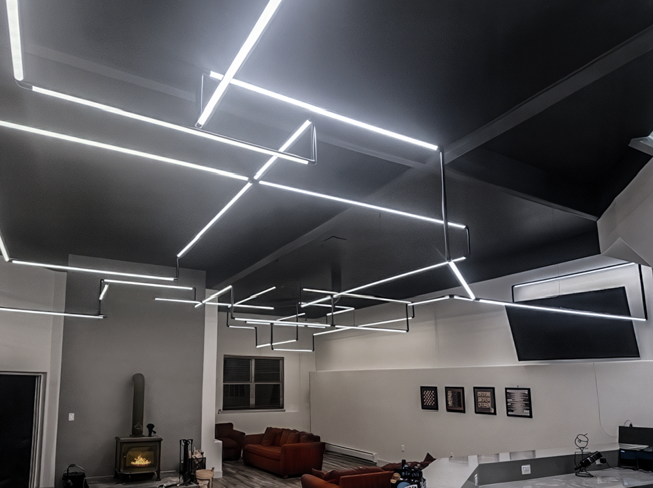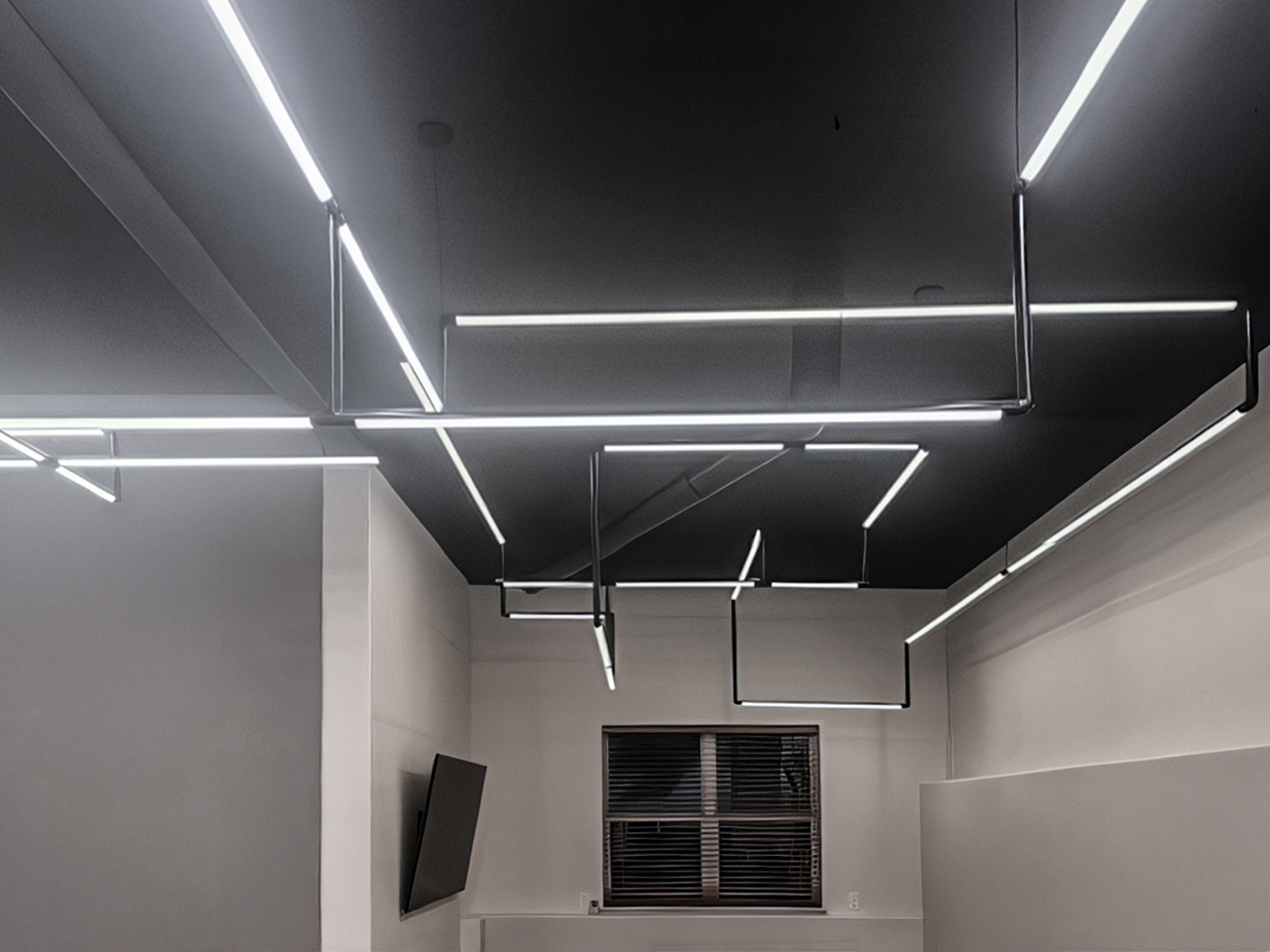 create a sculptural, geometric lighting installation that defines zones, delivers functional illumination, and