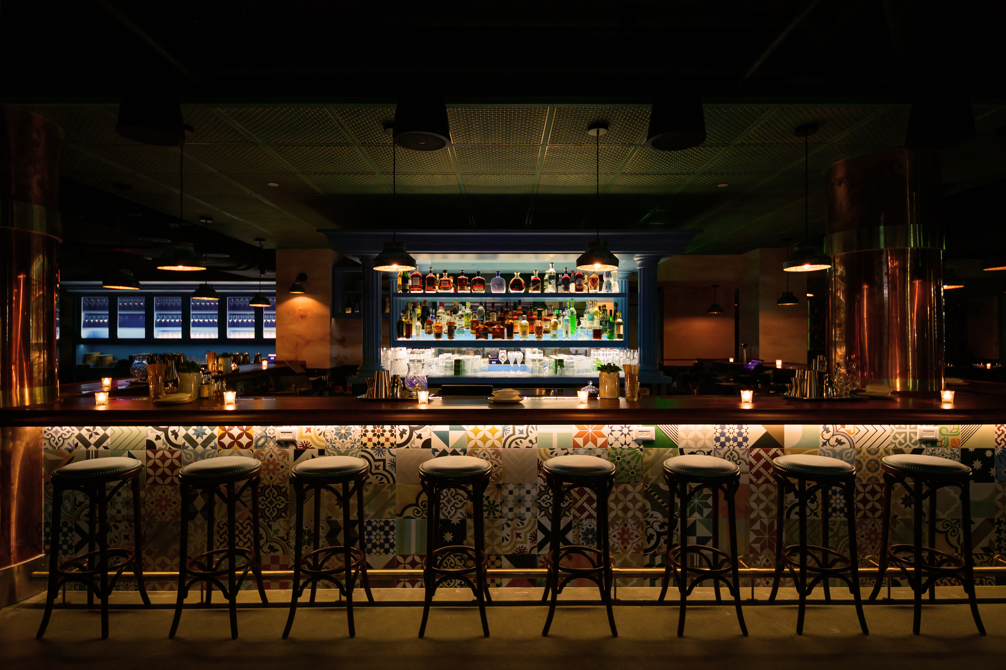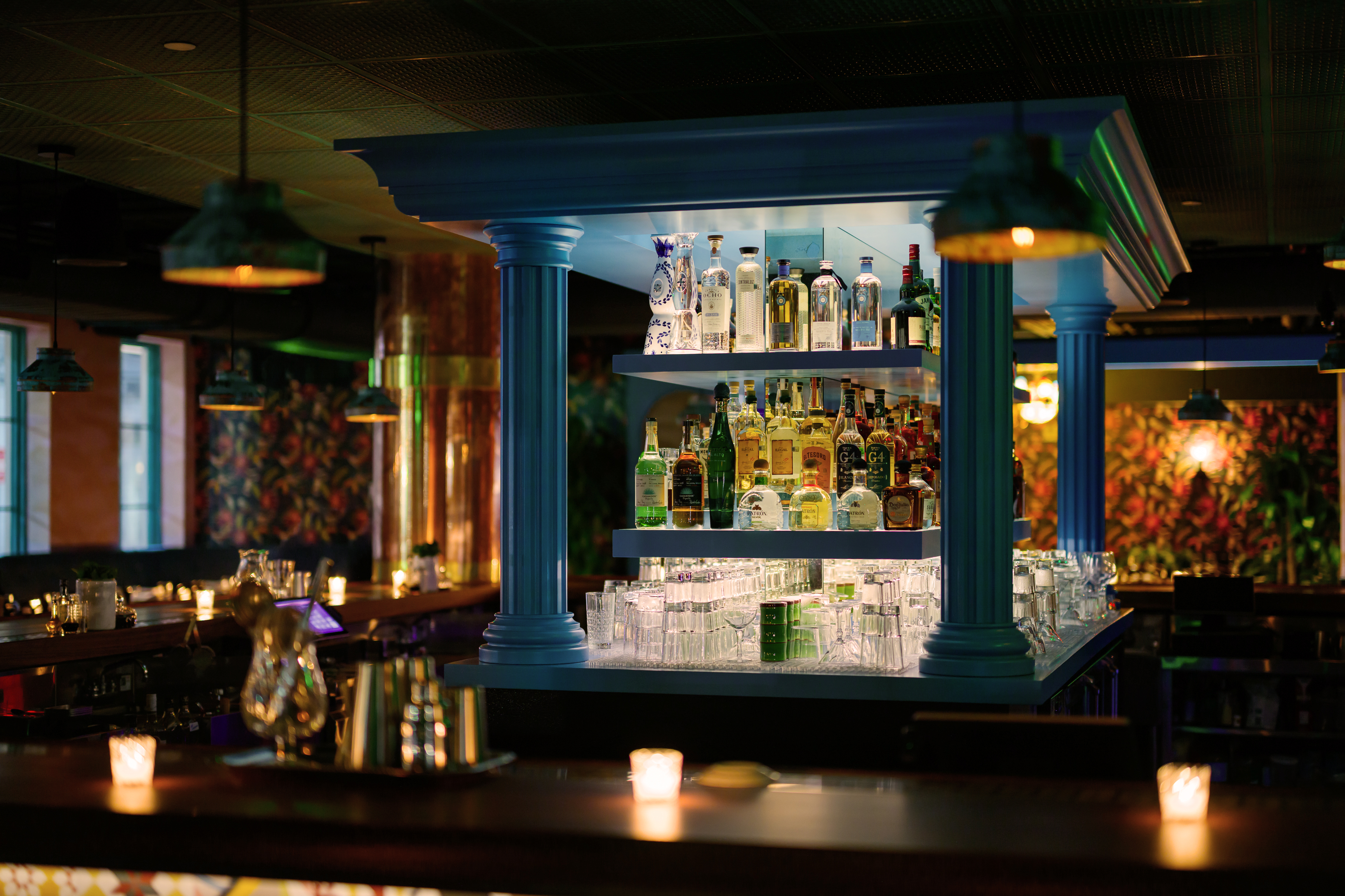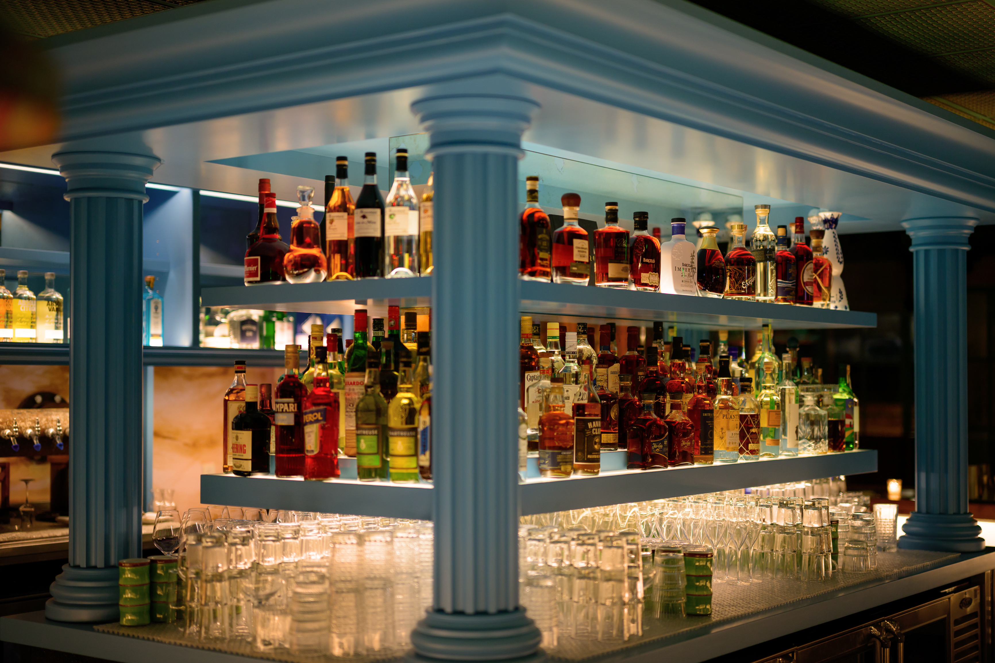 lighting inside glass cabinets, so even when they're closed, you still see the bottles glowing. There's