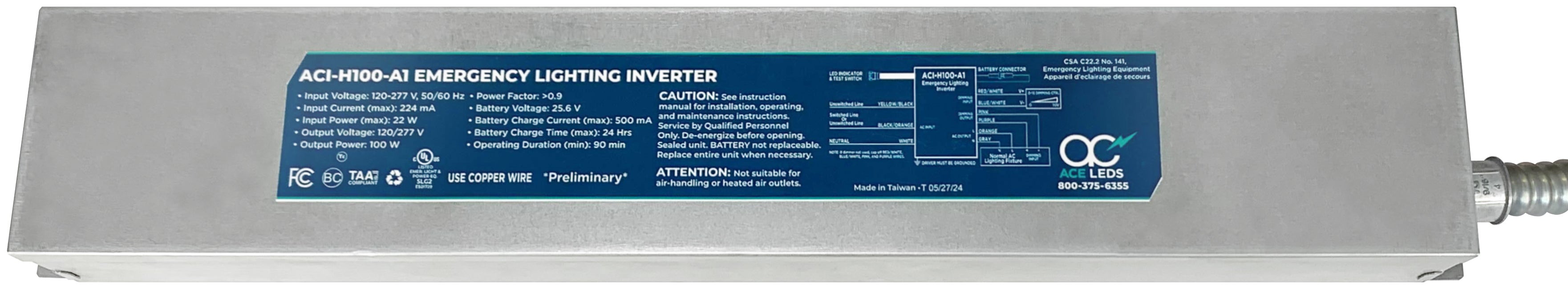 The ACE ACI-H100-A1 is a UL Listed sine wave output inverter designed to provide power to the designated emergency lighting fixture. In a power loss situation, the ACE ACI-H100-A1 will supply 120 or 277 VAC power to operate up to a 100W total connected load for not less than 90 minutes. The ACE ACI-H100-A1 works in conjunction with LED, fluorescent, and incandescent lamp and fixture types and will automatically run switched, normally-on, or normally-off designated emergency fixtures. The ACE ACI-H100-A1 is ideal for applications requiring an emergency source in elevated ceilings, for high output luminaires, and lamp types utilizing Edison screw (ES) designs. The ACE ACI-H100-A1 features a replaceable long-life nickel-cadmium battery and is covered under ACE’s five-year warranty For custom designs and layout assistance, email our design team