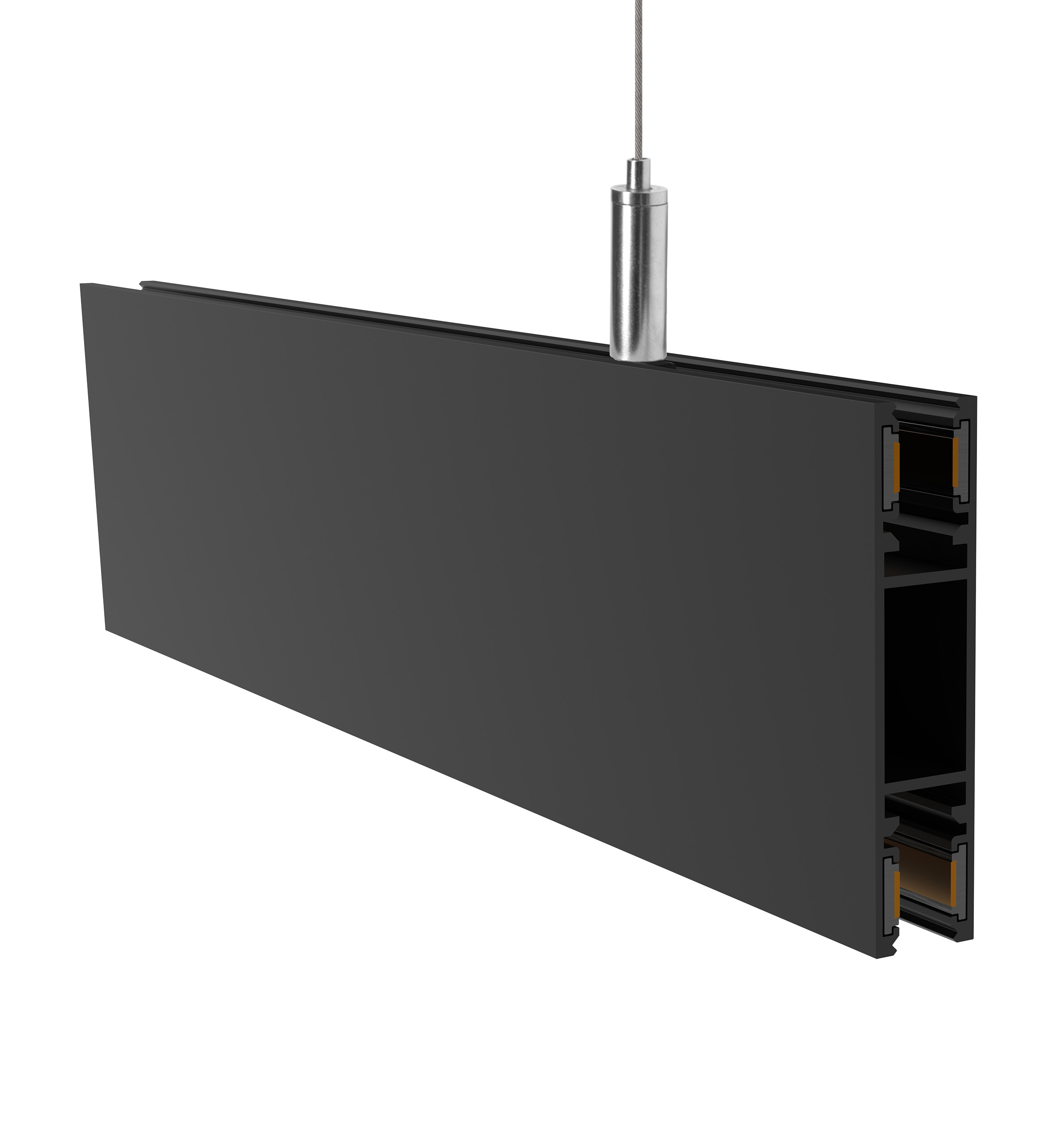 MTHL48 MicroTrack™ HiLo Suspension is a 48VDC suspension track system housed in a 1 15/16" high x 7/16" wide track with a 1/4" slot profile which offers up and down lighting in multiple fixture options in a clean, contemporary style. Suspended from the ceiling with cables. For a clean architectural aesthetic, a slot cover is supplied with track channels for hiding the copper busbars and mounting screws. For custom quotes and layout assistance, send your drawings and ideas to our design team: