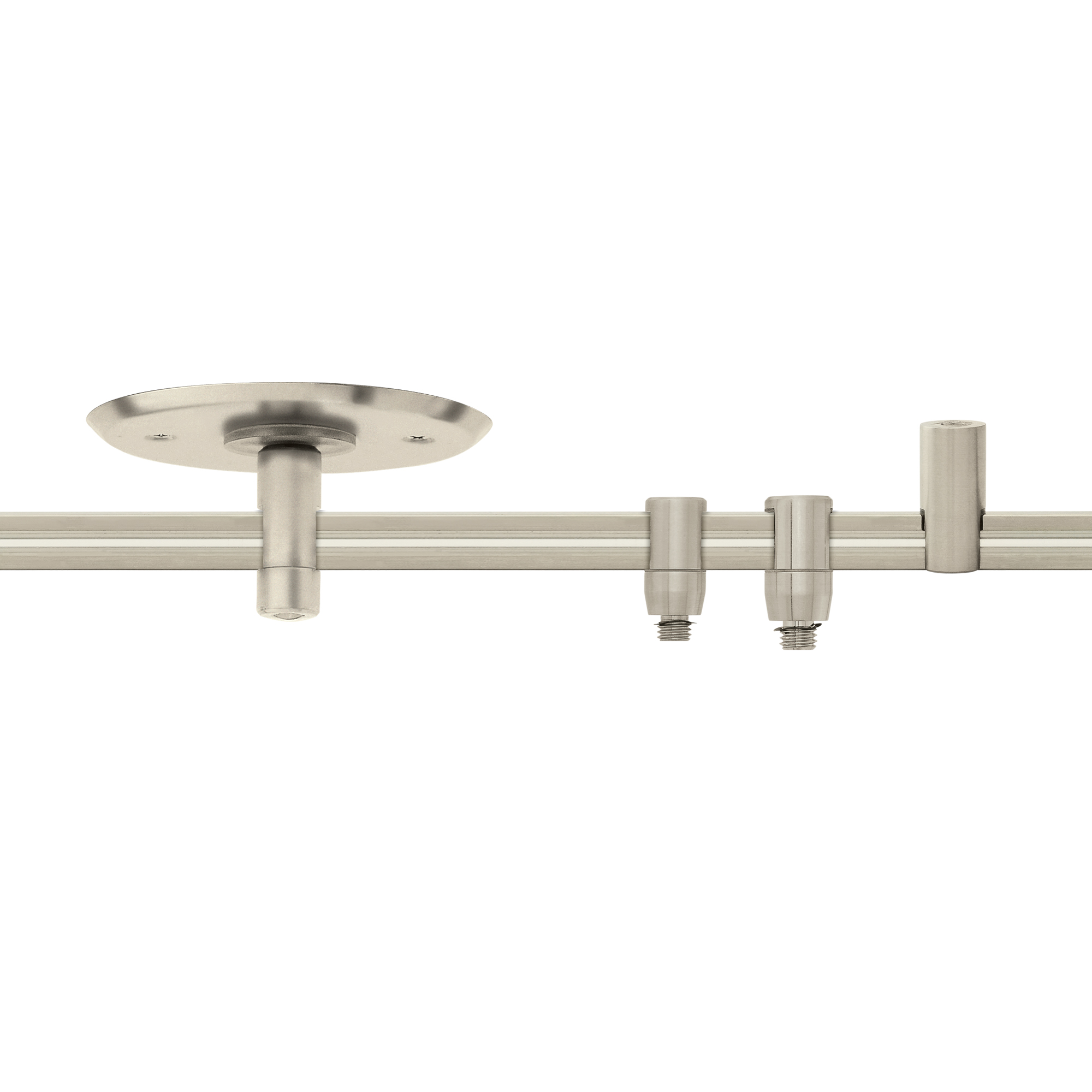 The system features straight rails that are hand-bendable or pre-bent rail with a selection of heads and pendants.
