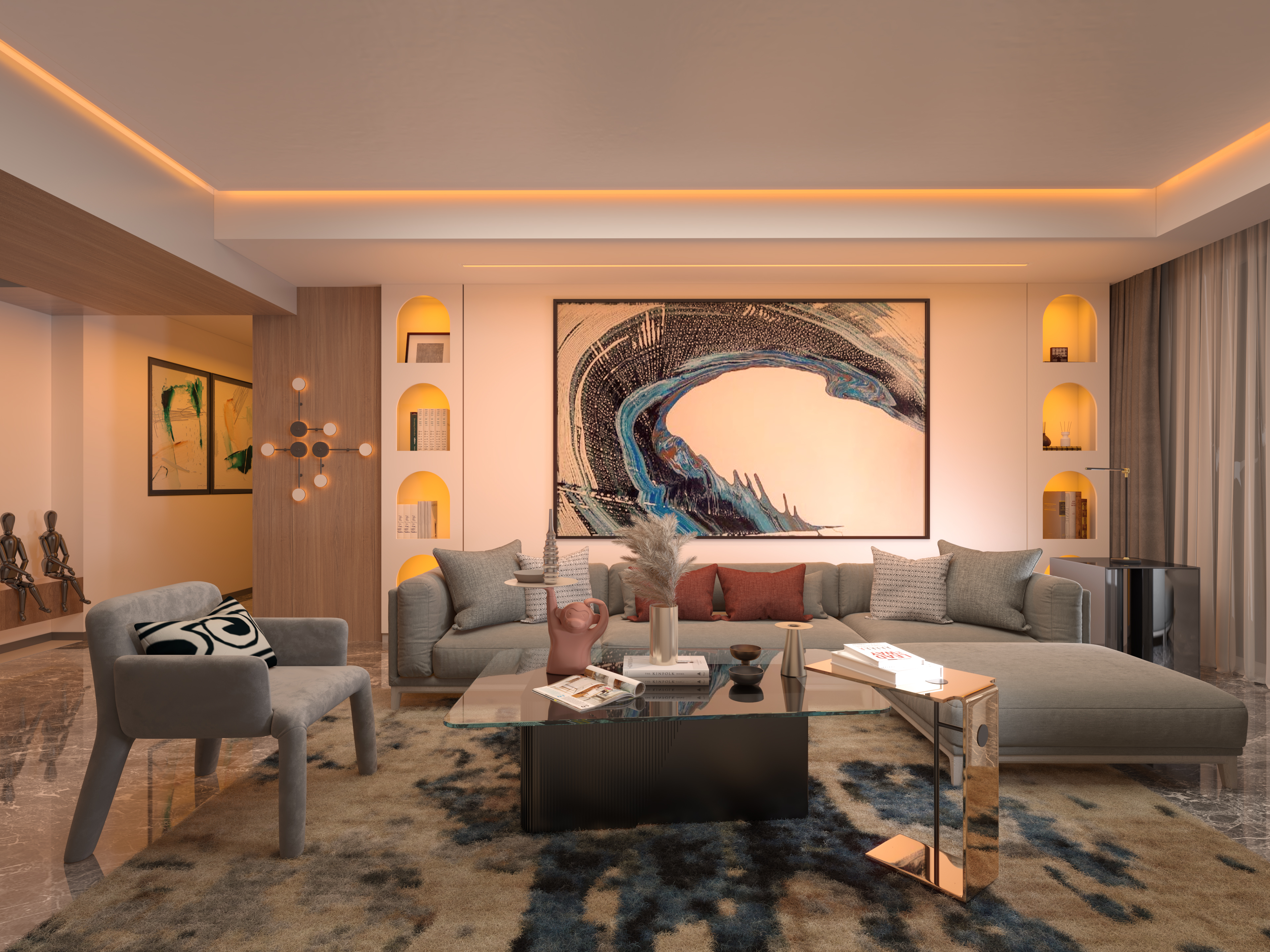 Our new generation of the Reveal System washes the wall from the very top of the ceiling highlighting the wall with continuous illumination. Recessed within 5/8" drywall without the need for joist modification. The 24VDC low-voltage system uses PureEdge's superior designer-grade 95+ CRI LEDs rendering art and color in their truest forms while producing uniform brightness. Simply mount the slim profile plaster-in extrusions within 5/8" or thicker drywall, 24" from the projected wall. The system is sold in 1' increments up to 20' and can be cut in the field. Continuing to redefine the relationship between lighting and interior design, Reveal Wall Wash invokes dramatic yet refined illumination by highlighting art and creating depth of architectural features. The Reveal Wall Wash with Warm Dim technology (