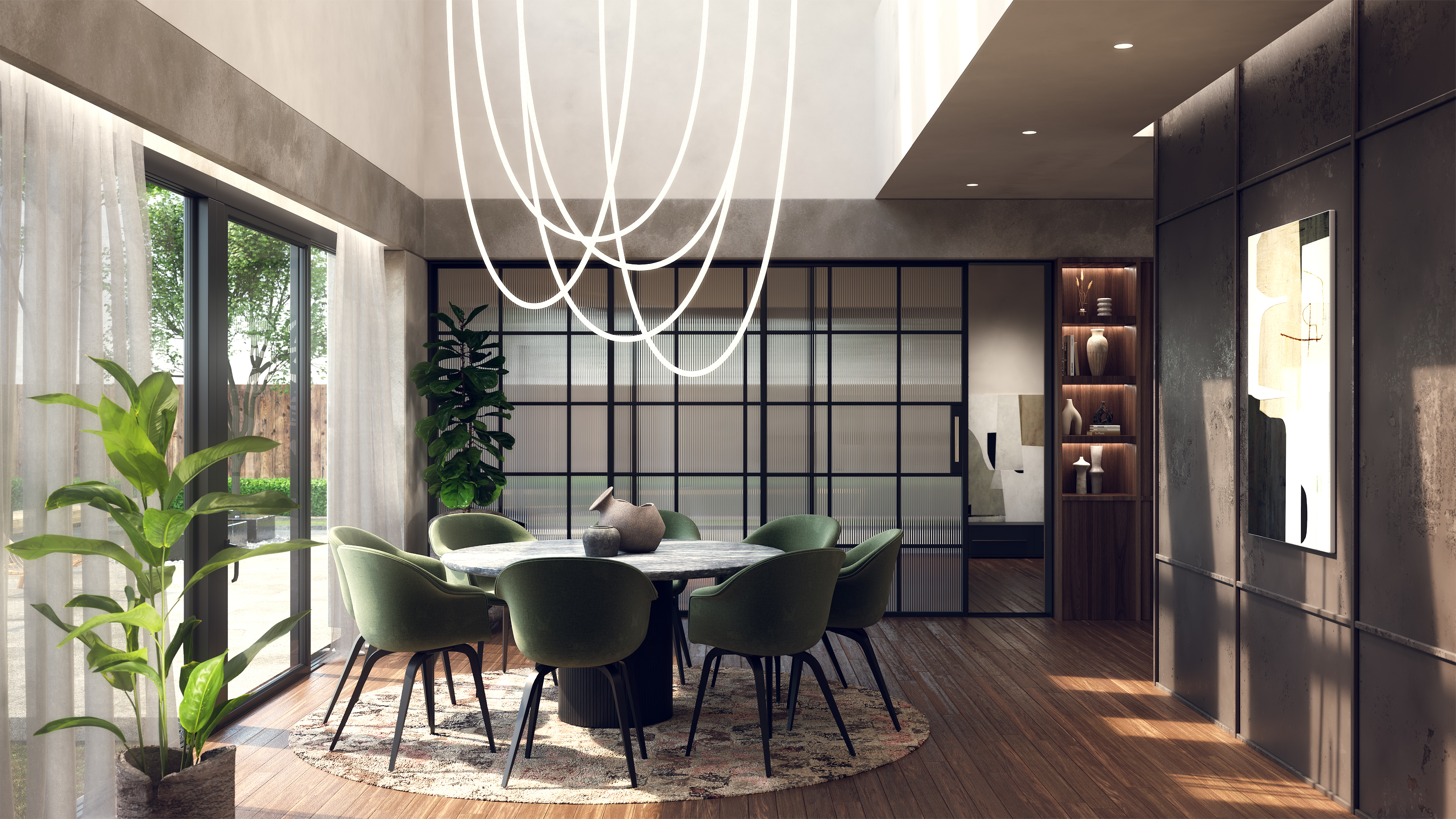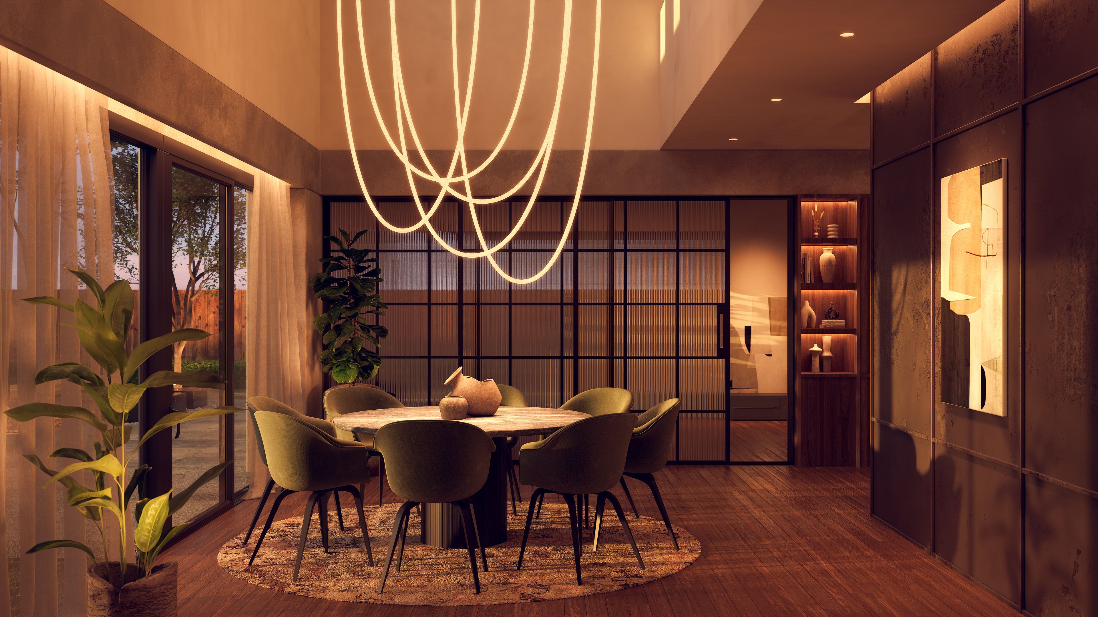 Designed to offer both a sophisticated aesthetic and an inviting ambiance, the Trapeze Wave Oval enhances interiors with its fluid, seamless flow. Choose from Static White, Warm Dim (