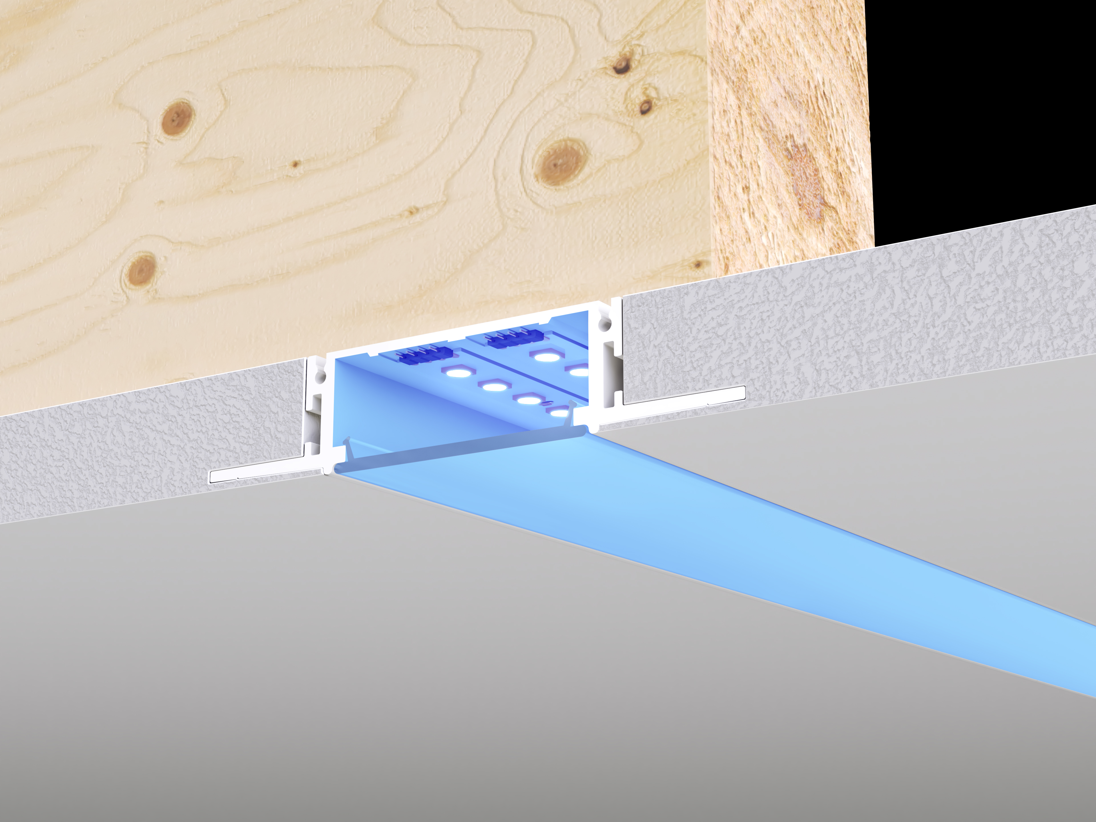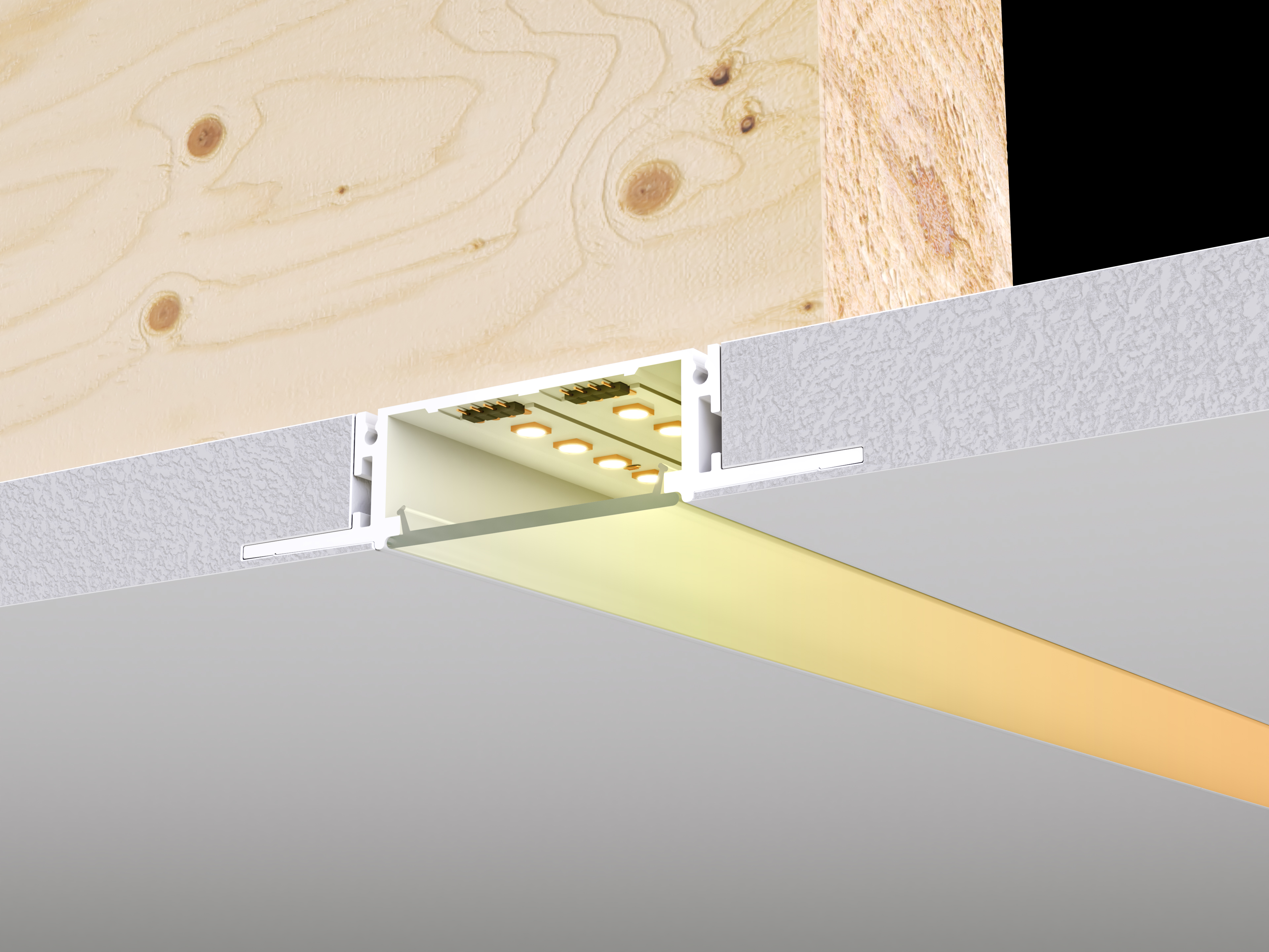 TruColor™ RGBTW light engine is another original and innovative design that comes from the family of Plaster-in 24VDC systems pioneered by PureEdge that recesses within 5/8" drywall, without any framing modification required. Redefining the relationship between Lighting and Interior Design, this innovative and highly efficient system blends seamlessly into the drywall, becoming part of the architecture. The slim extrusions, LED strips, and lenses are field-cuttable and ordered in 1' increments (up to 20' before re-feeding), power feeds included. Multiple runs of channel mount flawlessly together providing smooth and glare-free general illumination using designer-grade color rendering LEDs (97+ CRI). With the ability to run in vertical, horizontal, and diagonal directions, the compositions are truly endless. TruLine 1.6A Plaster-in LED System is offered in multiple color temperatures and wattage options. Click here for all