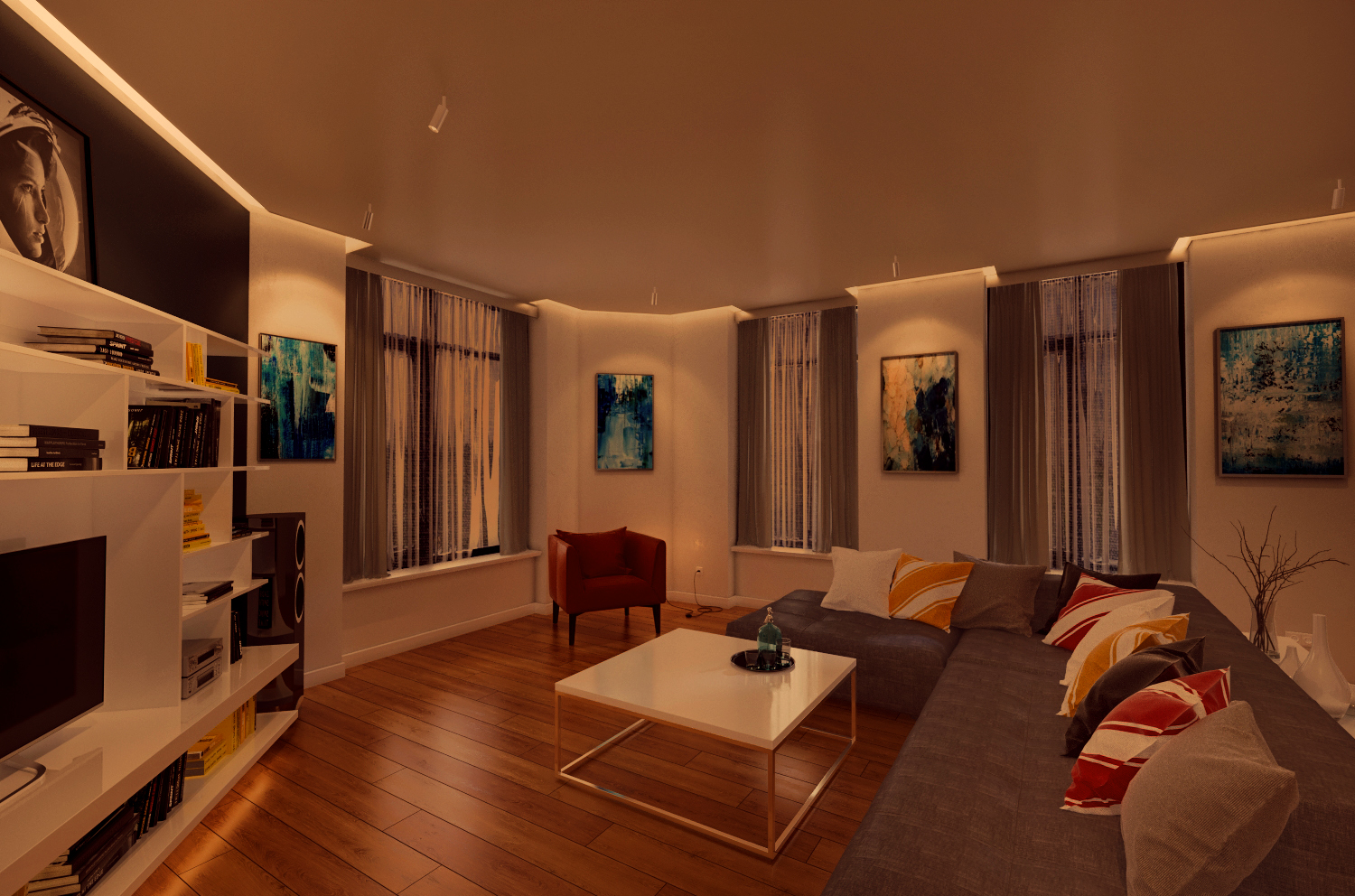 Verge Ceiling is another innovative design that comes from the family of plaster-in 24VDC systems pioneered by PureEdge that recesses within 5/8" drywall without joist modification. Continuing to redefine the relationship between lighting, architecture and interior design, this visionary system elegantly highlights ceiling perimeters while emitting smooth and continuous ambient illumination. Ordered in 1' field-cuttable increments up to 20'. The slim plaster-in aluminum extrusion has a 4" paintable backer plate. Warm Dim technology (